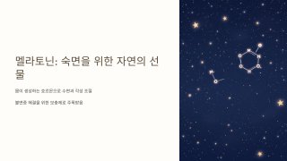 멜라토닌은 우리 뇌 속 송과선에서 분비되는 호르몬으로, 흔히 ‘수면 호르몬’이라고 불립니다. 해가 지고 어두워지면 자연스럽게 분비가 늘어나 몸을 잠들 준비 상태로 이끌어 주죠. 하지만 멜라토닌의 역할은 단순히 숙면을 돕는 데만 국한되지 않습니다. 항산화, 면역 강화, 노화 지연 등 다양한 기능을 수행하기 때문에 현대인들에게 꼭 필요한 호르몬 중 하나로 꼽힙니다. 오늘은 건강 전문가이자 블로거의 시선으로 멜라토닌 효능 10가지를 하나씩 깊이 있게 풀어드리겠습니다.